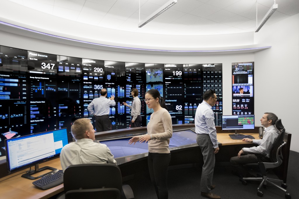 Coinaxisx Risk Management Center provides a comprehensive view of the various investment portfolios and how they fit within pre-established guidelines. Built in 2014, its front-end consists of a 27' by 8' interactive touchscreen designed to visualize data in ways that allow for rapid comprehension. Its back-end systems, which connect to every Coinaxisx office worldwide, continuously run a wide range of operational readiness, risk, and stress test monitors.